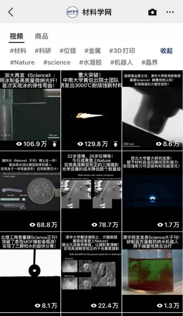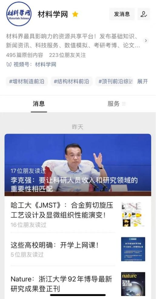 在这个背景下,我们基于材料学网微信公众号、视频号、抖音号和头条号等自媒体平台,提出了一系列具有市场前景的创新型服务。希望在相关账号不断的运营与宣传下,能够让具有核心优势的新材料相关一流学科,不断地碰撞出科研火花,增强对最新研究成果和产业前沿观点的宣传力度,实现科技和资本力量对接的新局面,加速科研成果的高效转化,扩大信息的传播半径,实现更多媒体的合作共生,以增强信息的接受率,提高信息资源的利用率,达到信息增值的效果,推动材料行业的发展。