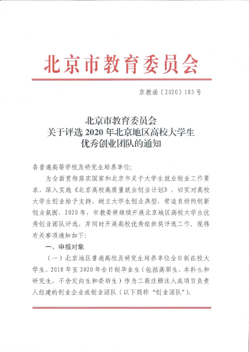 北京市教育委员会关于评选2020年北京地区高校大学生优秀创业团队的通知