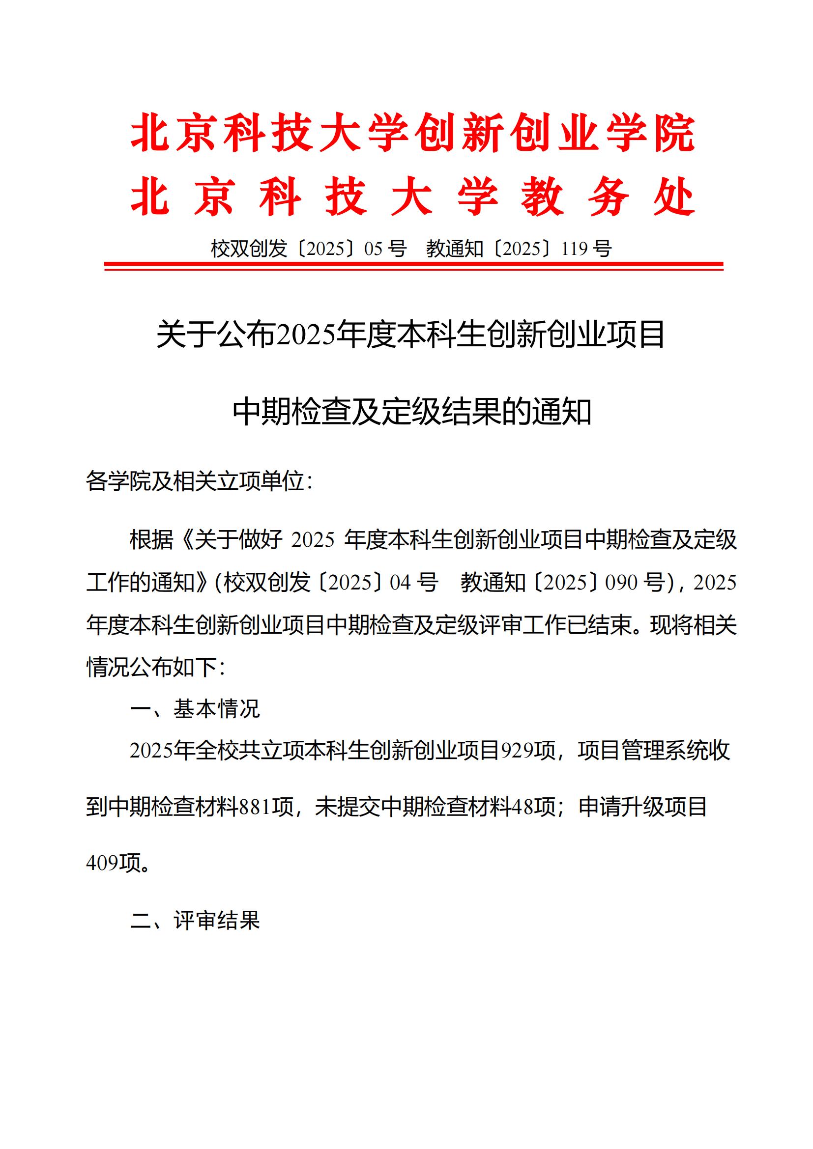 校双创发〔2025〕05号 关于公布2025年度本科生创新创业项目中期检查及定级结果的通知