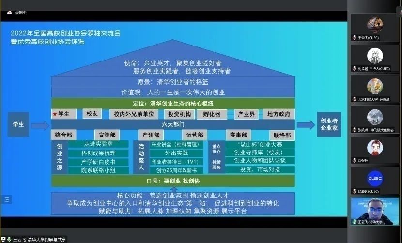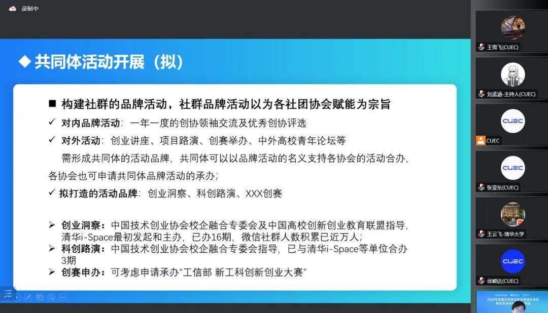 2023年1月7日,全国高校创业协会领袖交流会暨优秀创业协会评选活动圆满召开,高校创协领袖共同体(以下简称“共同体”)筹备组正式成立。活动由中国技术创业协会校企融合专业委员会(以下简称“专委会”)主办,国际大学创新联盟、中国投资协会投资信息专业委员会协办,易华录、浪潮、海创汇、金茂集团、太库科技、江阴高新区(北京)异地孵化器等单位支持,清华大学、北京大学等30余个高校学生社团联合发起。