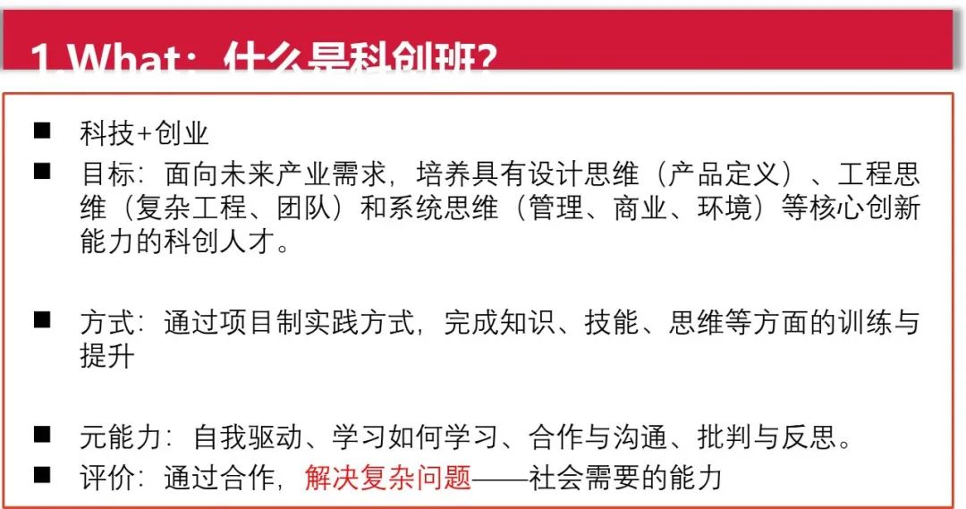 宣讲第二部分为解析科创班。这部分主要分为“what”,“why”,“who”,“how”几部分。