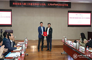首先,学校党委副书记、副校长薛庆国进行了欢迎致辞。薛庆国简要介绍了北京科技大学的创新创业育人工作情况,并聘任李泽湘教授担任学校创新创业导师。他表示,学校非常重视学生创新精神和创业能力的培养。多年来,学校机器人队在比赛中连续摘冠,获评“小平科技团队”。他希望,结合借鉴科创学院的创新创业教育模式,共同推进学校创新创业教育。